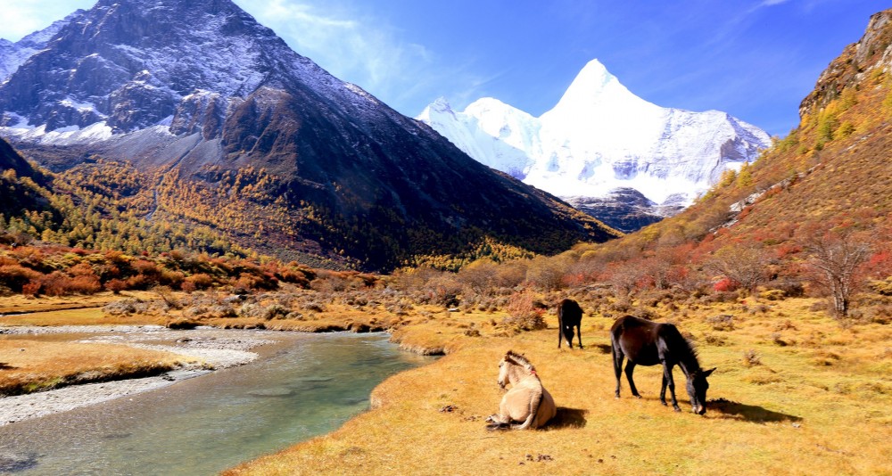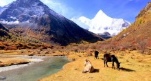 早餐后从亚丁景区门口乘光观车出发前往令人神往的亚丁景区。景区以仙乃日(6032,藏语观世音菩萨)、央迈勇(5958,藏语文殊菩萨)、夏诺多吉(5958,藏语金刚手菩萨)三座雪峰为核心区,北南向分布,三座雪山呈品字形,三峰藏名为“念青贡嘎日松贡布”,意为“三怙主雪山”,是众生朝圣积德之所在地。由于特殊的地理环境和自然气候,形成了独特的地貌和自然景观,是中国保存最完整的一处自然生态系统。),沿途欣赏万亩青杨树、傍河、藏寨,翻越波瓦山(海拔4530米),抵达日瓦乡,换乘亚丁景区观光车,翻越牛郎神山(海拔4760米),远眺仙乃日神山(海拔6032米,慈目注视脚下人间仙境,夏天雪线下瀑布成群连片,气势宏伟壮观,山脚下分布着由草地、森林、湖泊完美组合的景致,美不胜收。仙乃日,藏语意为“观世音菩萨”,是稻城三座神山的北峰。是三座神山中海拔最高的一座。其状巍峨,象菩萨端坐在莲花台上,浑身浸透高贵气质的“仙乃日”,顶峰终年积雪不化,其山形酷似一个身体后仰的大佛,傲然端坐在莲花座里,她的怀中抱着一个巨大的佛塔,阳光照在仙乃日神山上会金光灿灿。)抵达亚丁村,经扎灌崩,抵达冲古寺(藏语意为填湖造寺,海拔3900米),由草地、森林、小溪和嘛呢堆组成的天然冲古草坪,使你真正感觉到大自然的雄壮、美丽、神奇和妩媚。客人徒步或自费乘景区电瓶车(单程50元,往返80元)前往洛绒牛场(“日松贡布”三座神山环绕,贡嘎河从草场穿梭,林间溪流潺潺,与牧场木屋交相辉映,构成了一幅原始而又迷人的景色,令人们进入返朴归真的境界。这里观“日松贡布”三座神山尽收眼底。卡斯峡谷狭长深邃,谷台海拔3800米,谷底海拔2900米,谷内森林密布,怪石嵯峨,飞泉瀑布,吼声震天。谷中雾霭变幻莫测造型各异的岩峰时现时隐,时如天宫,时如仙女下凡,时如天马行空,腾云驾雾,真可谓一大奇观。)上山时可远观夏诺多吉神山(意为金刚手菩萨,海拔5958米),央迈勇神山(意为文殊菩萨,海拔5958米),站在央迈勇神峰下,转身向后瞧去,由群山环绕着的宽阔峡谷间,森林、草地、溪流和睦地各守一方,这气势莽莽的自然景观,不就是人间仙境呀!不就是香格里拉所在吗,真是让人感慨万千。因牛奶海和五色海海拔高,客人务必根据自身实际情况选择自费骑马前往游览。(牛奶海,海拔4800米,又叫洛绒措,古冰川湖,状如水滴,四周雪山环绕,湖水清莹碧蓝,山止成瀑,以其玲珑秀雅水色翠蓝而著名。牛奶海在央迈勇的山坳里,呈扇贝形,中间是碧蓝的雪水,周边则是一圈乳白色环绕,这圈乳白色大致就是牛奶海名称的由来。牛奶海是美丽的,远远望去,仿佛碧玉镶嵌在雪山之中,纯净安详。纯净的湖水给人以平和安宁的心境,而蓝湛湛的海子并不透明,显得神秘莫测。传说能治聋哑病的圣湖。)、五色海,(海拔4600米,由于光的折射下,产生五种不同颜色而得名:其真名为“登崇措”。五色海它位于仙乃日与央迈勇之间,海拔4600米,湖面呈圆形。面积0.7公顷,现代冰谷下伸至湖畔,雪山倒影湖面,呈现奇幻的色彩。是藏区著名的圣湖(佛经中赞誉该湖与西藏羊巴雍措齐名),据传能“返演历史,预测未来”。晚上住:亚丁村或香格里拉镇