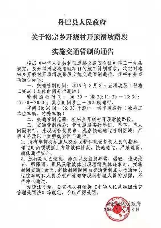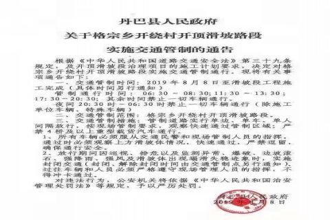 甘孜州公路管理局发布《G227线洛戈梁子至庭卡乡庭卡村段大修工程实施交通管制通告》,决定对G227线洛戈梁子(K1477052至庭卡乡庭卡村(K1491000)实施交通管制。管制时间:2019年9月2日至2019年11月20日。