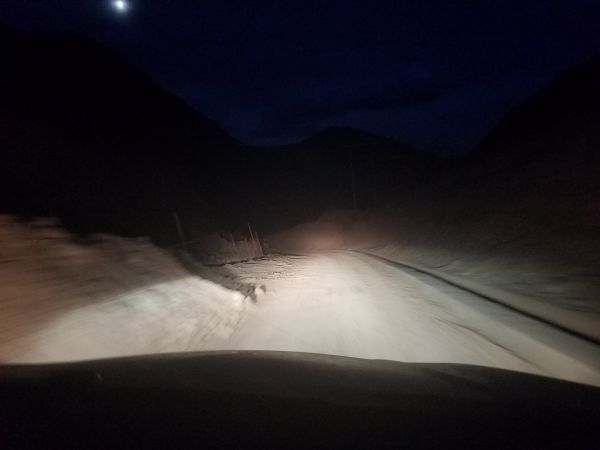 映秀—日隆 危险国首G350卧龙熊猫沟段山体滑坡,从下午两点多到现在为止,都没通,今晚过不去了,就地过夜。道路中段。