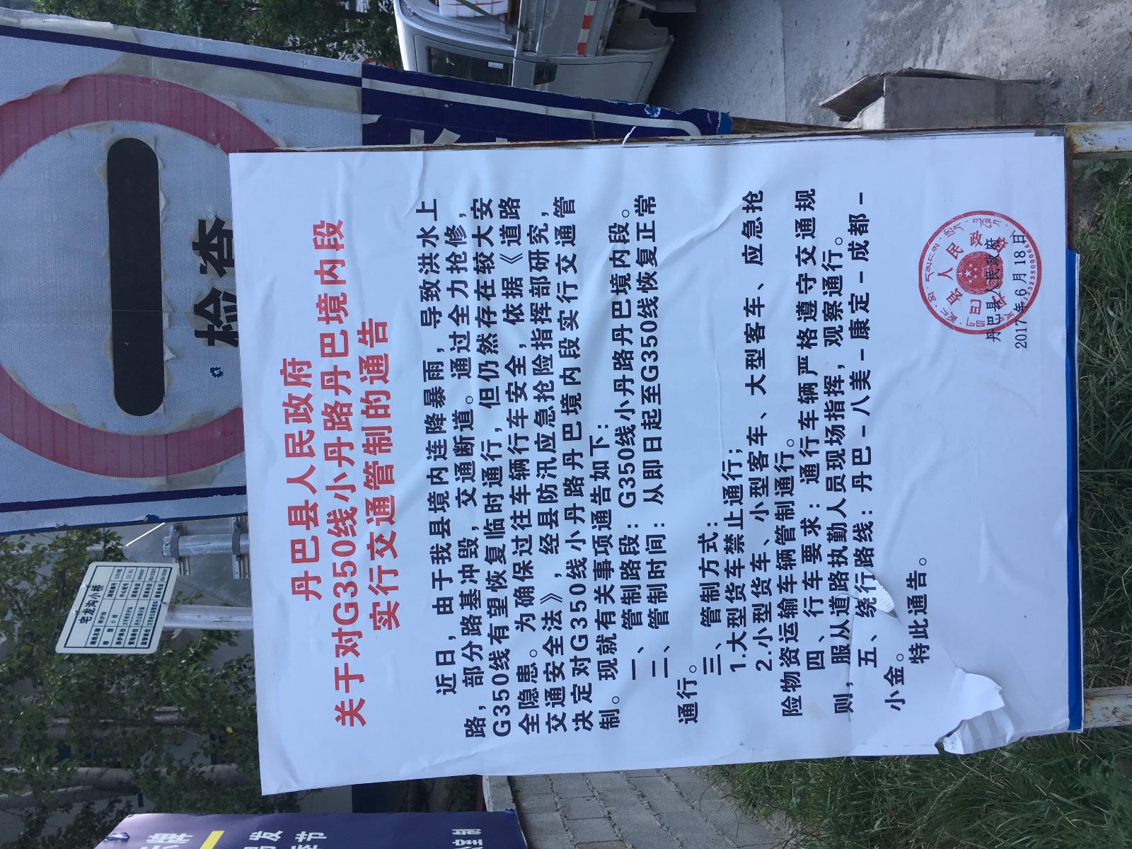 日隆—丹巴 良好都江堰到小金 303省道 路况良好 小金去丹巴有水毁路段 便道轿车通过有困难 另离丹巴30公里处出车祸了 交警正在处理中预计晚上可通行