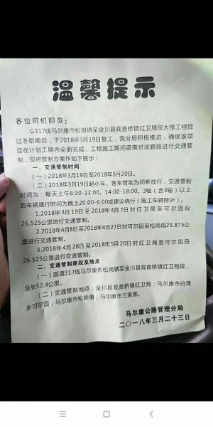 1、2018年3月19日至4月7日对红卫局至可尔因段26.5公里进行交通管制