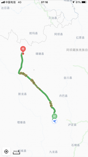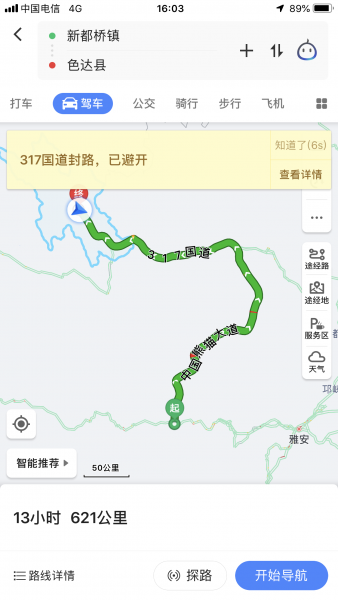色达—甘孜 良好今天从新都桥到色达,一路畅通,出乎意料的顺利!前几天高德就显示317封路要绕行,600多公里13小时,而百度这边显示4百多公里9小时。仔细对比,百度这边走成那线快到甘孜县时往上走(s455,就是大家说的x6983吧?),而高德没有收录s455,造成两者极大差异。综合分析后决定信任百度。早上7点50从新都桥七天酒店出发,一路用百度导航开到色达,中间停歇了半个多小时,居然下午3点半就到达色达(走的时候导航显示预计到达时间17点20)!道路畅通,车少风景好,特别是s455全程柏油路面,路况极好,风景秀丽,值得一游!