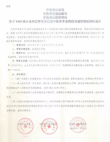 【S303线小金丹巴界至丹巴县中路乡李龙桥段,交通管制延期】为有序实施S303线丹巴县城至道孚县八美镇路面大修工程和水毁修复任务,确保过往车辆通行安全,根据《中华人民共和国道路交通安全法》《四川省中华人民共和国道路交通安全法实施办法》等有关规定,决定在施工期间对S303小金丹巴界(K218752)至丹巴县中路乡李龙桥段(K249135)实施交通管制延期。管制时间:2019年8月1日至2019年9月30日。管制方式:2019年8月1日至2019年9月30日,每日上午930至下午18:00为全封闭式交通管制,其余时间为通行时间。详情请戳下图!(信息来源:甘孜公路)