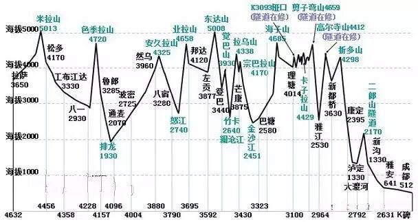 行驶路线:成都—240km—四姑娘山—103km—丹巴—160km—道浮—75km—炉霍—105km—甘孜—93km—马尼干戈—15km—新路海—99km—德格—109km—江达—125km—昌都—171km—邦达-94km—八宿—90km—然乌—129km—波密—89km—通麦—127km—林芝—19km—八一—127km—工布江达—206km—墨竹工卡—68km— 拉萨。