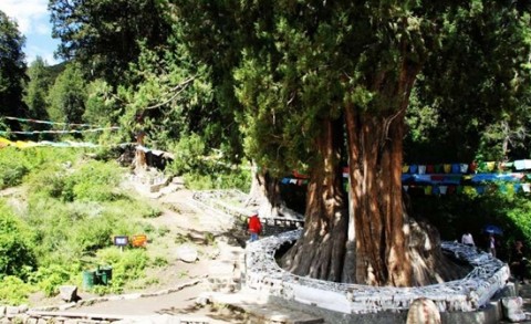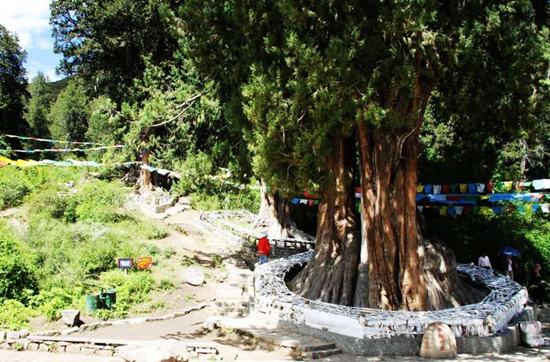 其中位于古柏林中央的一株“世界巨柏之王”,高达50多米,树冠投影面积一亩有余,近6米的粗壮的树干更是几个人都无法环抱。当地人将这棵树龄已达2500年之久的古柏谓以“树神”的称呼,加以保护并膜拜。 相传,这株无声穿越历史的巨柏是苯教祖师辛绕米保且的生命之树,因此这片巨柏理所应当地被奉为圣地,“树神”周身缠绕的五彩风马旗,便是最好佐证。树林中随处可见的玛尼堆和远道而来朝拜于此的信徒,印证着另一种虔诚的所在。